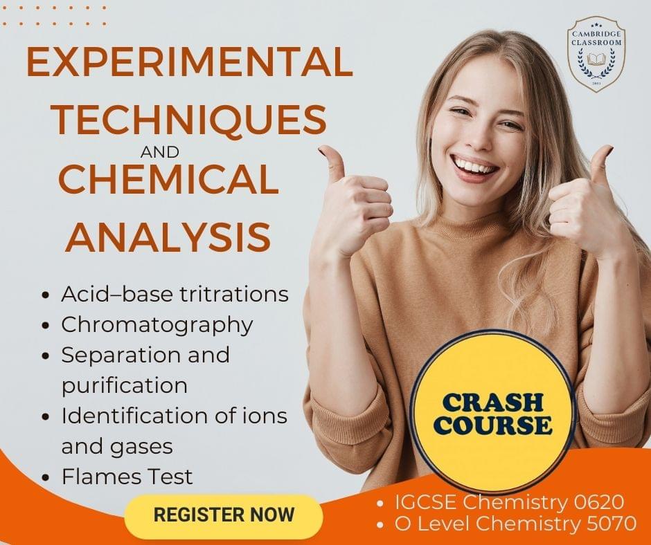 Introduction to Experimental Techniques and Chemical Analysis: Welcome to our comprehensive e-course designed to equip you with essential experimental techniques and chemical analysis skills for O Level Chemistry 5070 and IGCSE Chemistry 0620. Throughout this journey, we will explore experimental design principles and delve into various analytical methods, including acid-base titrations, chromatography, separation, purification, identification of ions and gases, and flame tests. By the end of this course, you will have the knowledge and confidence to design experiments, analyze data, and draw meaningful conclusions in your chemistry studies.